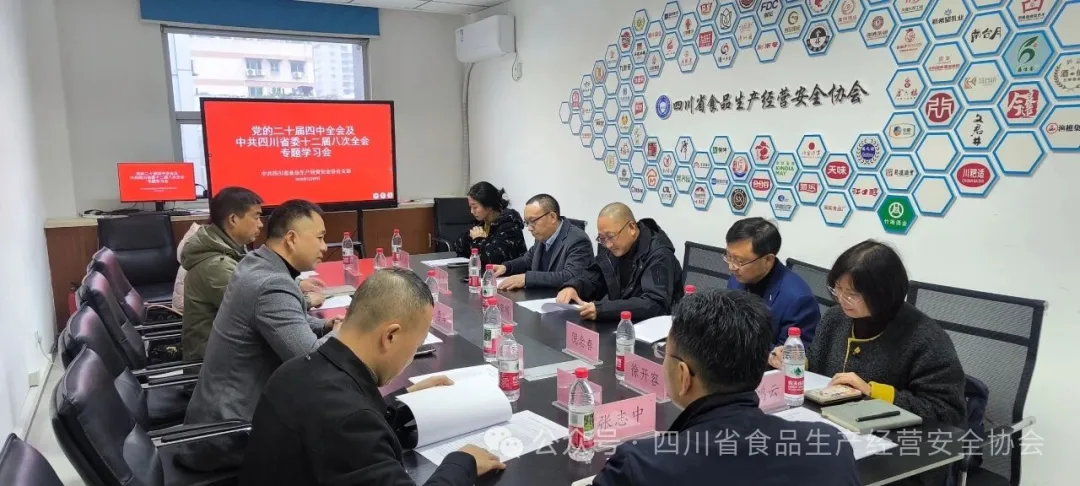 党建领航强根基 深学细悟启新程——中共四川省食品生产经营安全协会支部召开党的二十届四中全会及省委十二届八次全会专题学习会发表时间:2025-12-10 10:24 党旗飘扬映初心,砥砺奋进担使命。2025年12 月9日中共四川省食品生产经营安全协会支部在协会会议室隆重召开党的二十届四中全会及中共四川省委十二届八次全会专题学习会。协会会长李军,支部书记、秘书长吉礼,副秘书长张志中出席会议;副会长单位代表(四川久欣检测技术有限公司总裁赵洋,四川华盛兴邦净化工程有限公司董事长倪念春、副总经理徐开容,成都创世织造有限公司总经理徐智利,行政主管孙虎霞),四川省瓶罐装饮用水协会常务副秘书长张力,四川省乡村餐饮业协会代表陈诗雨共同参会,会议围绕全会精神学习贯彻、党建与行业发展融合展开深入交流。